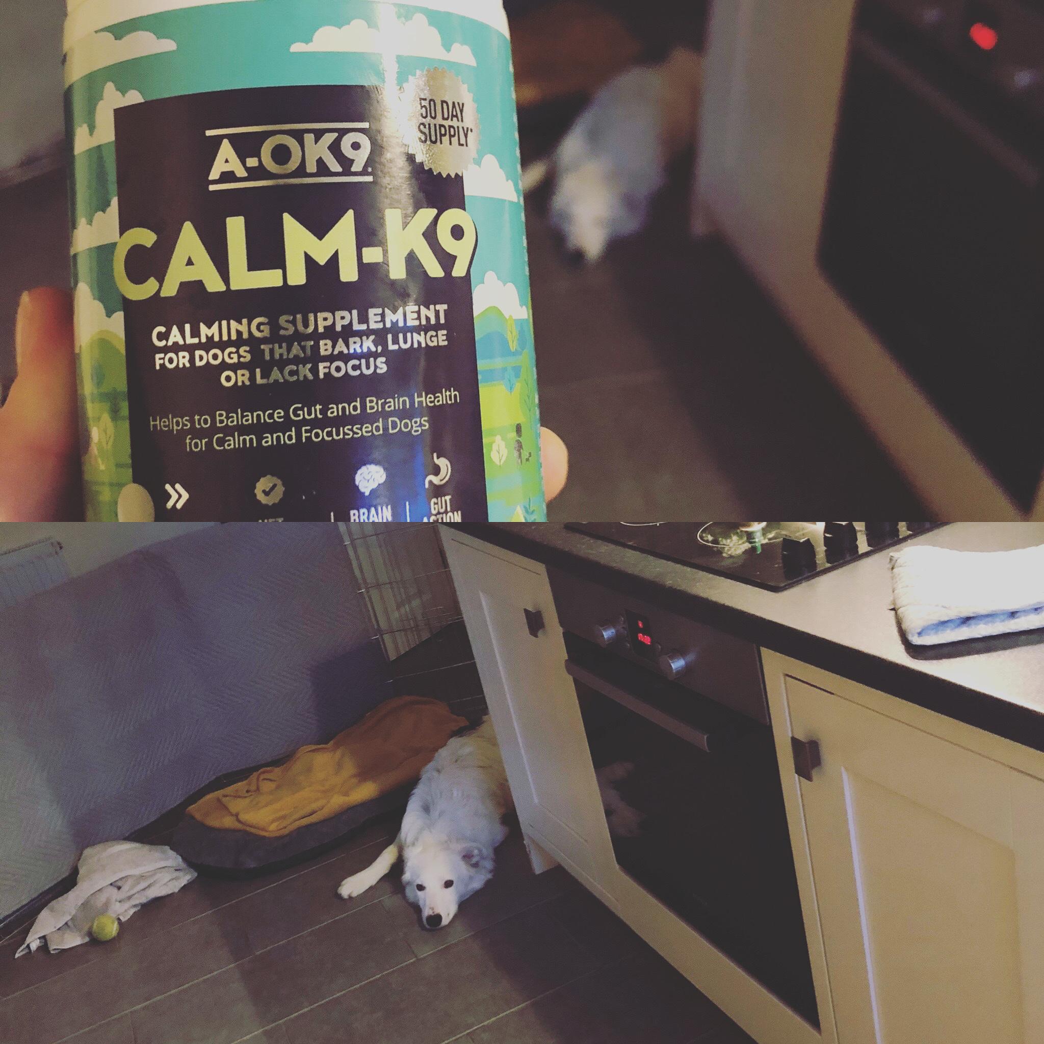 He couldn’t really settle again this evening due to reacting to noises on TV etc so he went in his crate at 8pm and slept all the way through like an absolute star! He did however seem very chilled at dinner time – here is a rare chill moment watching me cook tea! Could it be down to this A-OK9 powder we have started him on? Who knows only time will tell – more on that soon!